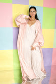 This blush pink abaya shimmers softly with every movement, featuring sculpted ruffle cuffs and a trail of covered buttons for a look that’s both romantic and refined.
